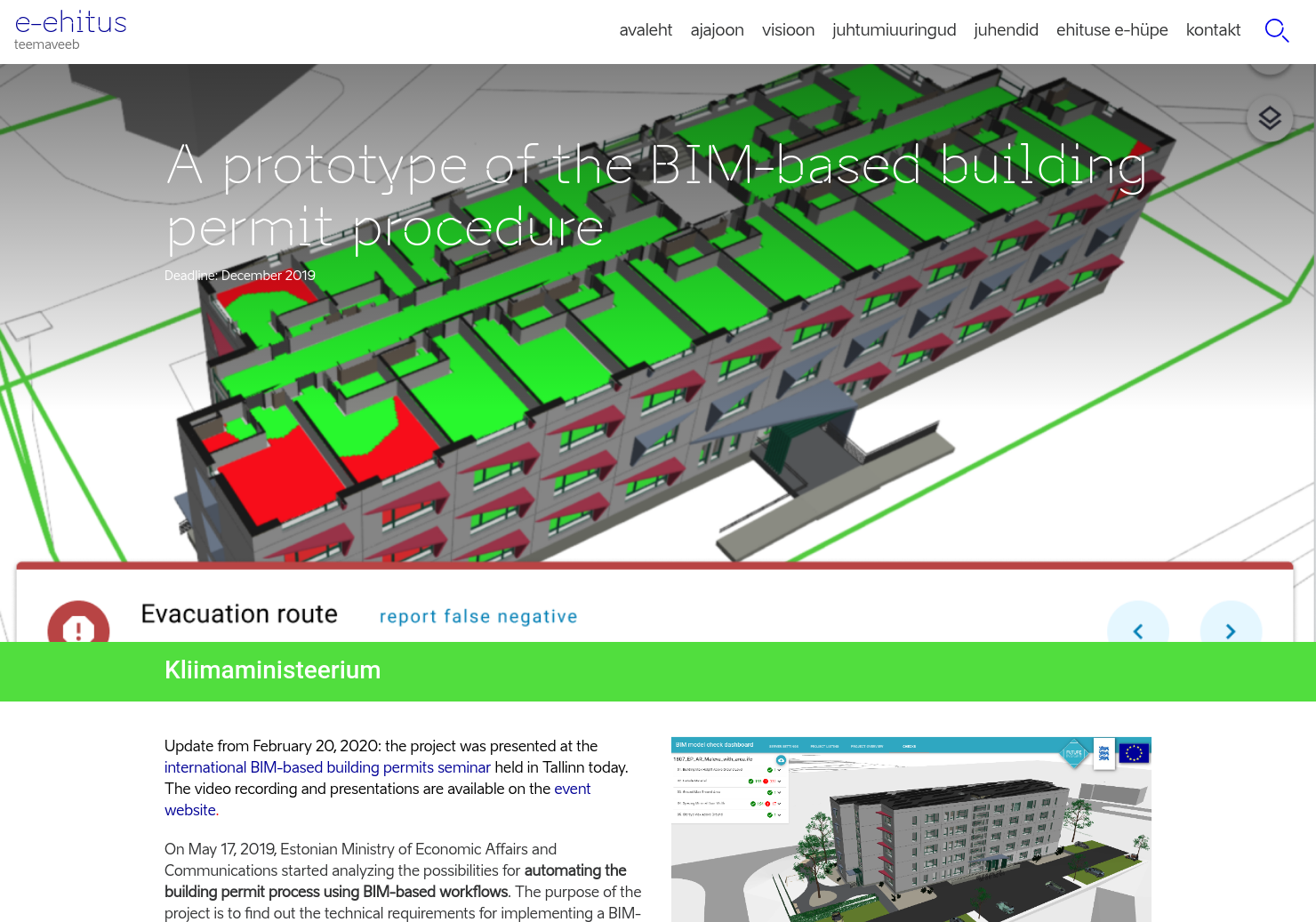 In Estonia BIM is an integral part of the e-construction strategy to create more efficient public services and to provide open access to public data related to the built environment. This project is a first step in this strategy and will help implement BIM in organisations and increase efficiency of public services related to construction. On the long run the project will increase the use of BIM and construction digitisation in Estonia, which ultimately will lead to the reduction of building lifecycle costs. Also the efficiency and quality of public services related to the building lifecycle will improve.